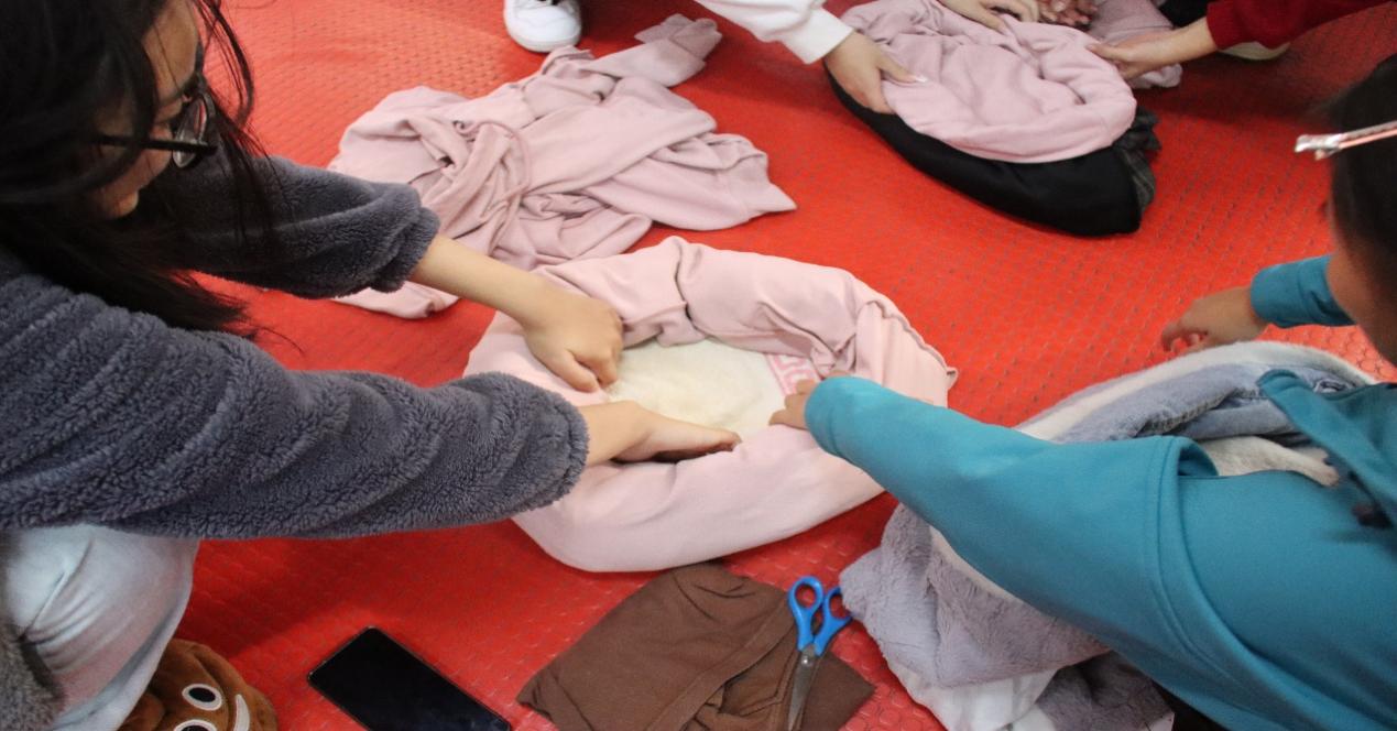 活动伊始,协会负责人根据参与人数合理分组,将同学们分为3个创作小组,并引导大家有序选取旧衣物、剪刀、针线、保暖填充物等活动材料。材料选取完毕后,各小组迅速进入创作状态,成员们分工明确、默契协作:有的负责整理分类旧衣物,剔除破损严重的部分;有的专注裁剪布料,根据流浪动物体型设计小窝尺寸;有的则细心填充保暖内衬,用针线将布料缝合固定,确保小窝结实耐用又温暖舒适。现场氛围热烈而温馨,大家充分发挥创意,在裁剪、缝合、装饰的过程中,不仅展现了动手实践能力,更将团队协作精神与协会“关爱动物、传递温暖” 的核心精神体现得淋漓尽致。