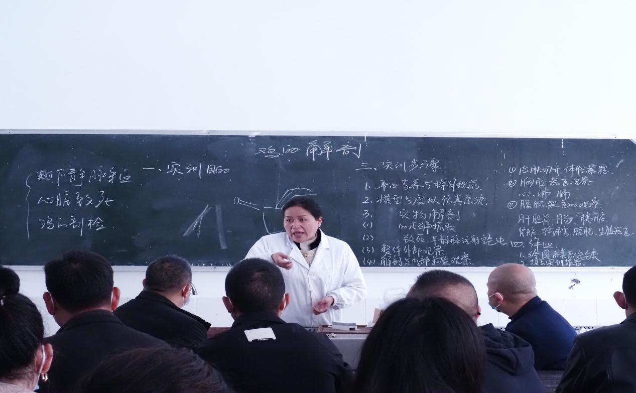 观摩结束后,培训转入实训楼实训场地,聚焦鸡采血与鸡解剖开展实操训练。我院苏五珍副教授为大家详细讲解了鸡翼下静脉采血的操作手法、鸡解剖的规范流程及病理观察的关键要点。