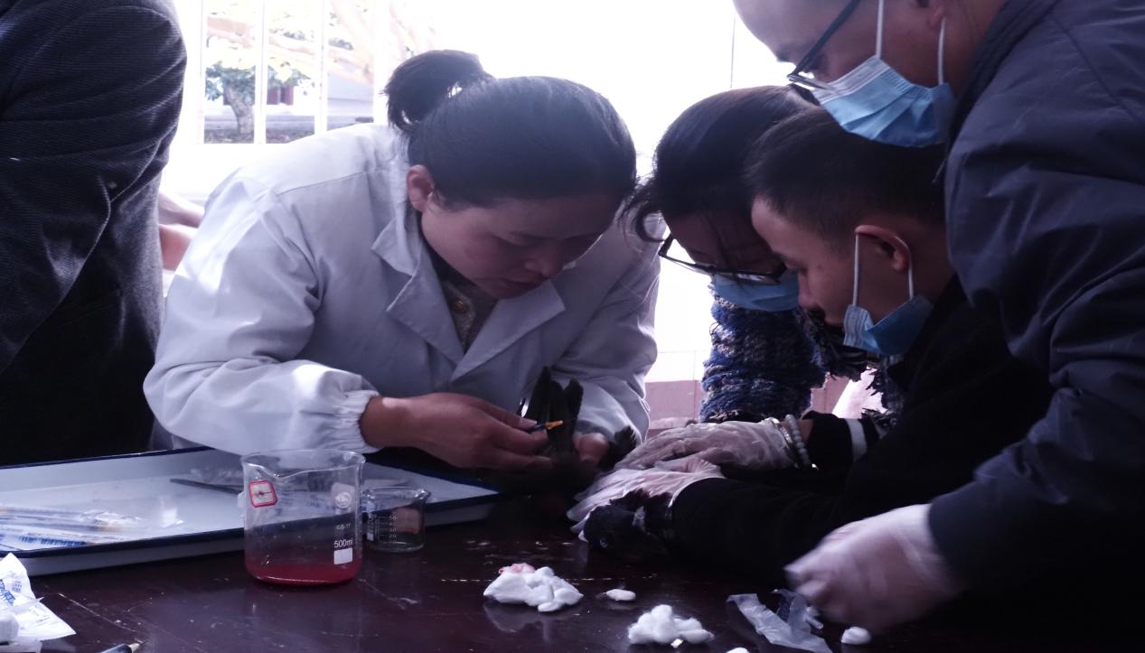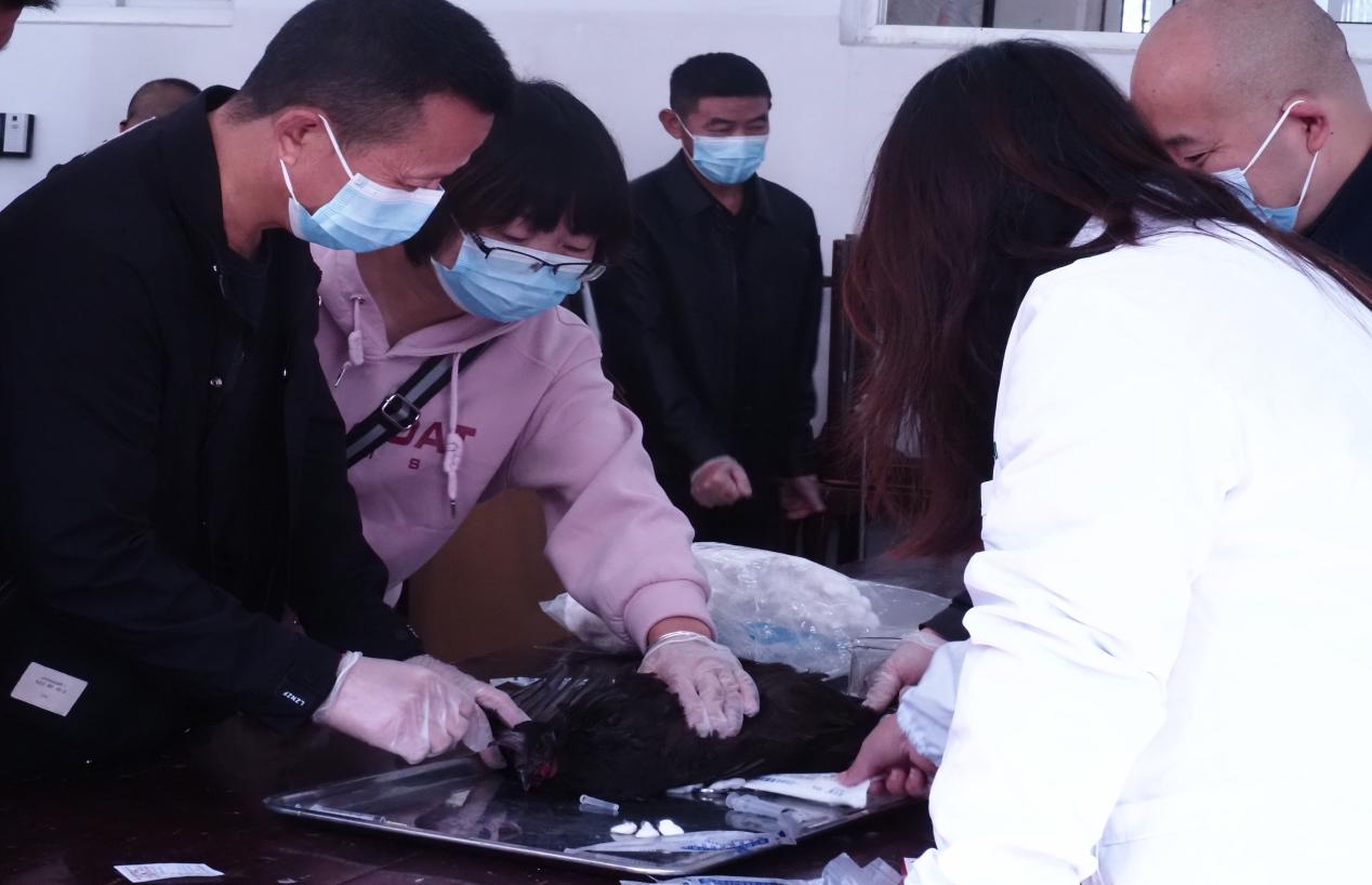 实训现场,苏教授进行了规范的操作演示,从器械选择、部位定位到操作手法、安全防护,逐一细致讲解。在随后的实操中,学员们认真动手,相互协作,依次完成了鸡只的采血和解剖任务。